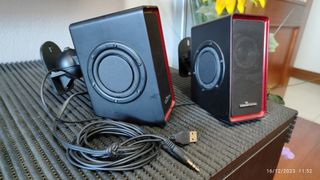 altavoz: Subwoofer, Woofer función especial: Tweeters Se incluyen soportes de pared rotativos. 20 w de potencia conexión USB conexión JACK medidas: 7 x 12,5 x 14,5 cm peso: 1,13 kilogramos Para PC, móvil, Portátil, Tablet, TV Muy estéticos, elegantes