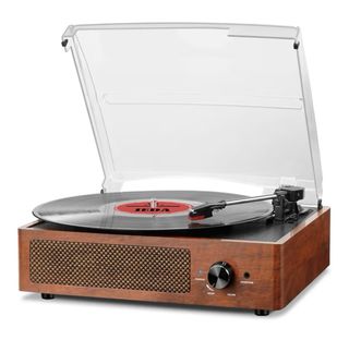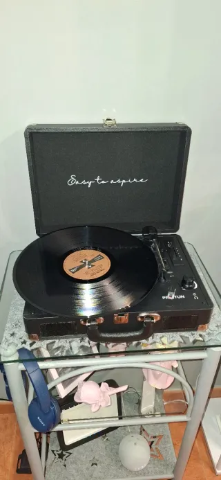 Tocadiscos con un diseño retro y elegante. - Acabado en color beige y negro. - Plato giratorio para discos de vinilo. Hay que cambiarle la aguja pero es economica en Amazon.
