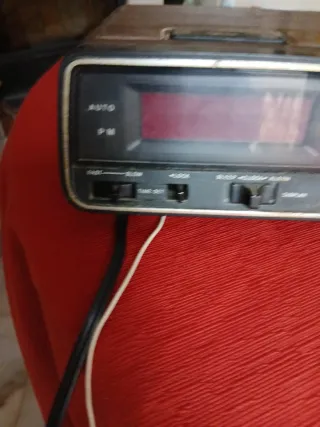 Radio despertador Sanyo de estilo retro. - Diseño clásico en tonos marrones y negros. - Pantalla digital roja. - Sintonizador de radio AM/FM.