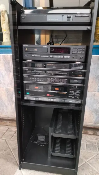 Se vende equipo de música AIWA vintage en buen estado, ideal para amantes del sonido analógico o coleccionistas de equipos Hi-Fi clásicos. El conjunto incluye tocadiscos, amplificador estéreo, sintonizador de radio y doble pletina de cassette, todo integrado en un mueble Hi-Fi con puerta de cristal que protege el equipo del polvo. Equipo robusto y de buena calidad, típico de los sistemas de alta fidelidad de los años 80-90. ⚠️ No incluye altavoces. Incluye: Tocadiscos AIWA Amplificador estéreo AIWA Sintonizador de radio AIWA Doble pletina de cassette AIWA Mueble Hi-Fi con puerta de cristal Espacio inferior para guardar vinilos