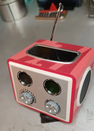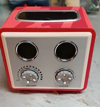 Radio con diseño retro y llamativo, acabado en rojo con detalles plateados. Antena extensible, altavoces laterales. Dos diales giratorios para control de volumen y sintonización. Ancho 11, alto 10 y fondo 9