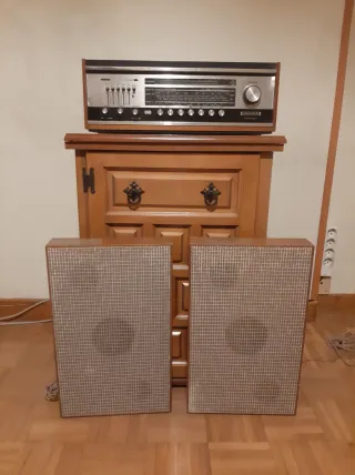 Receptor estereofónico de alta fidelidad Grundig Stereomeister 3000 de gama alta ("Meister") con sus altavoces originales Grundig serie Hi-Fi Box: el "santo grial" para un coleccionista de audio vintage. Panel de aluminio cepillado con el mueble de madera de nogal: un icono del diseño industrial europeo. Permite conectar altavoces externos y un tocadiscos. Utiliza válvulas (tubos de vacío) para la sección de radio y transistores para la sección de amplificación. (El mueble sobre el que está no se incluye).