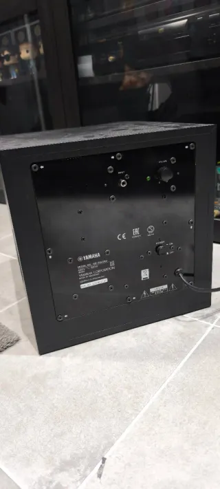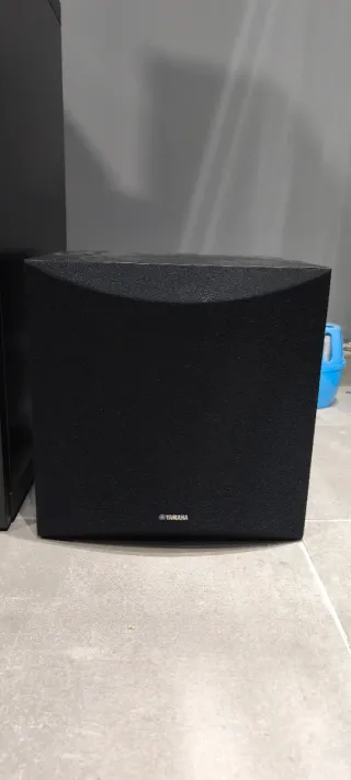Subwoofer Yamaha en color negro. Diseñado para ofrecer un sonido potente y claro. - Diseño compacto y elegante. - Ideal para complementar sistemas de audio. - Acabado en tela. No hago envíos.