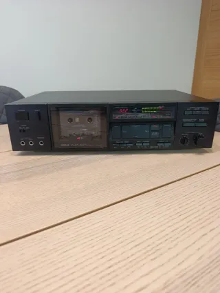 Yamaha K-600 componente de audio de alta fidelidad fabricado en Japón durante la década de 1980, conocido por su diseño "Natural Sound". Auto-Reverse: Permite la reproducción de ambos lados de una cinta sin tener que voltearla manualmente. Contador Lineal: Incluye una pantalla digital que muestra el tiempo o la posición de la cinta. Controles de Audio: Dispone de medidores de nivel tipo LED, reducción de ruido Dolby (B/C) y funciones de búsqueda de pistas como "Mute Search Entradas/salidas RCA universales, jack para auriculares y entradas para micrófono. El equipo funciona pero se le tiene que realizar limpieza de cabezales.