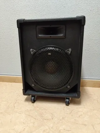 Altavoz de 12 pulgadas con un diseño robusto y práctico. - Altavoz de 12 pulgadas. - Incluye ruedas para facilitar su transporte y asa de agarre. - Rejilla protectora metálica. Potencia 200w Conexiones Jack 6,3 y cable rojo y negro