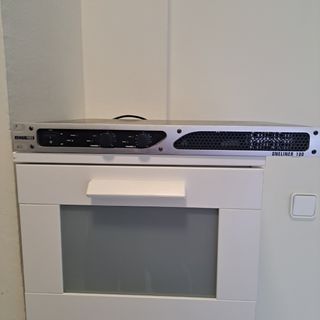 Etapa de potencia HQPower Oneliner 100. - Color plateado y negro. - Diseño de rack.