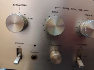 Amplificador de audio Kenwood KA-3500 en color plateado. - Control de tono con ajuste de graves y agudos. - Selector de altavoces A, B, A+B. - Control de balance. - Control de loudness.