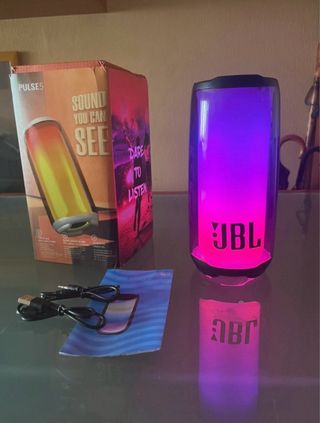 Altavoz portátil con iluminación LED. - Sonido perfecto. - Diseño cilíndrico. - Iluminación que cambia de color. - Logo de JBL en la parte frontal.