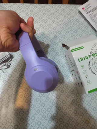 Cascos inalámbricos en color morado. - Sin usar los pedi de otro color. - Diseño plegable. - Incluye cable de carga. - Manual de instrucciones.