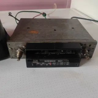 Radio cassette Skreibson 9501 con altavoz. - Diseño vintage. - Carcasa metálica plateada. - Panel frontal negro con dial y botones.