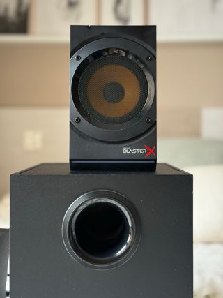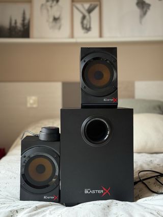Sistema de altavoces sound blaster en color negro, de alta calidad. Sistema 2.1 Diseñado para gamers para sonido mejorado y envolvente. Practicamente nuevos.