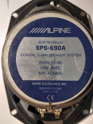 Pareja de altavoces Alpine en buen estado. Ideales para tu coche. - Modelo SPS-690A: Sistema coaxial de 3 vías, 6x9" (16x24 cm), 250W pico, 50W RMS, 4 ohms. - Modelo SXE-0825S: Sistema coaxial de 2 vías, 3-1/2" (8,7 cm), 150W pico, 20W RMS, 4 ohms. - Fabricados por Alpine Electronics, Inc.