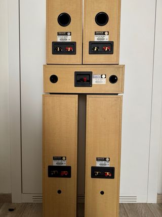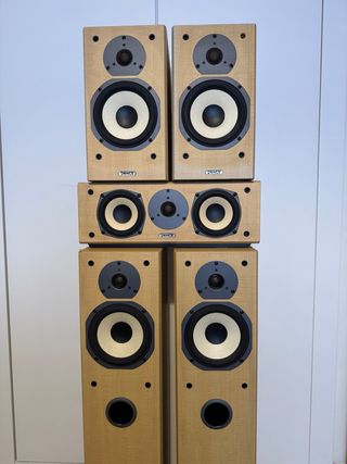 Sistema de altavoces Tannoy 5.1. - Configuración de altavoces 5.1. - Acabado en madera clara y detalles en gris.