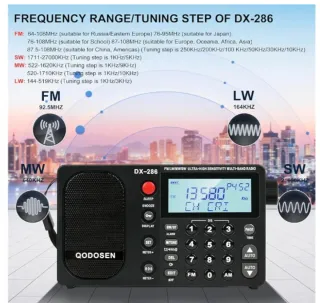 Radio portátil de la marca Qodoson, modelo DX-286. DX-286 Radio portátil de Onda Corta FM estéreo/Am/LW/SW Radio ultrasensible de Banda Completa con chipset TEF6686, Pantalla LCD, función de Alarma RDS y batería Recargable 18650 (Negro - Diseño compacto en color negro. - Recepción de FM, LW, MW y SW. - Pantalla digital. - Teclado numérico para sintonización directa.