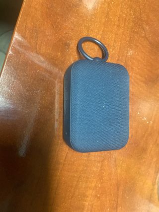 Altavoz portátil con un diseño moderno y llamativo. - Rejilla frontal de color azul. - Controles en la parte superior. - Acabado en negro. Como nuevo