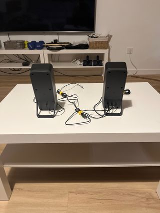 Vendo este par de altavoces de la marca Genius, ideales para usar con tu ordenador, televisor o cualquier dispositivo con salida de audio (jack 3.5mm). Marca: Genius. Configuración: Estéreo 2.0. Diseño: Acabado negro con parte superior imitación madera y detalles en plata. Funcionalidades: Incluye control de volumen y puerto Line In frontal para conectar el móvil o un MP3. 🛠️ Estado: Usados, pero en buen estado estético y de perfecto funcionamiento. Incluyen fuente de alimentación.