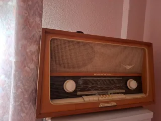 Radio antigua de sobremesa marca Grundig. Coge con fuerza FM tambien Onda corta. El resto de bandas No, porque ya no se emite o ha habido un apagón en Am,esto es importante saberlo. Tambien puedes conectarle un reproductor externo y usarla como el mejor amplificador. - Acabado en madera lacada,con pulsadores y botones frontales para ajustes de sintonia y volumen.Indicador de ojo magico. - Panel frontal con altavoz,buen sonido. Es a valvulas y funcionamiento analogico. *Se puede enviar.