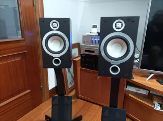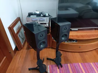 Muy buen estado. Uso tranquilo en hogar sin olores. Color arce claro (parecido al roble). Los drivers están intactos y la madera muy bien cuidada (ver fotos). Son perfectos para un sistema de alta fidelidad HiFi en salas pequeñas/medianas o como monitores de escritorio de alto nivel. Para envíos necesito un par de días para preparar embalage adecuado. Cada uno pesa 4 kg. Type: Passive Positioning: Standmount Enclosure: Bass Reflex Port Position: Rear Way system: 2 Nominal Impedance: 8 Ohm Frequency Response: 55 - 20.000 Hz Sensitivity: 87 dB Dimensions (W x H x D): 16.5 x 29.8 x 22 cm