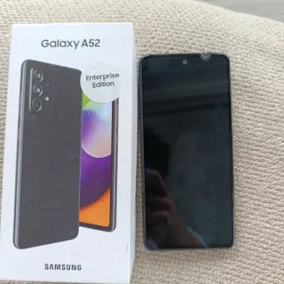 Teléfono móvil Samsung Galaxy A52 en color negro. Funciona perfectamente. Pantalla Super AMOLED 6.5. Cámara cuádruple. Cámara principal 64 MP con estabilización 6Gb RAM y 128Gb de almacenamiento Resistencia IP67 (Agua y polvo) Bateria en buen estado NFC y altavoces estereo No tiene cargador