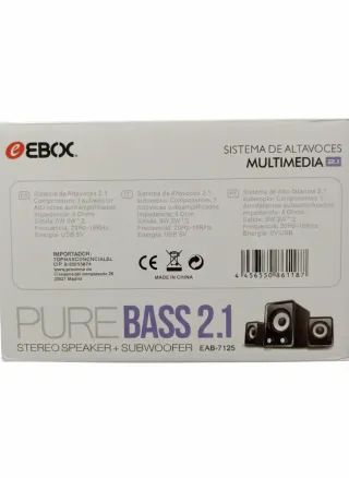 Sistema de altavoces multimedia EBOX 2.1. - Altavoces autoamplificados. - Impedancia: 4 Ohms. - Salida: 5W + 3W*2. - Frecuencia: 20Hz-18KHz. - Energía: USB 5V.