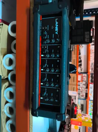 Amplificador Laney Theatre 120x4 en color negro y rojo. - Diseño compacto y robusto. - Panel frontal con controles de canal. - Conexiones versátiles para diferentes usos.