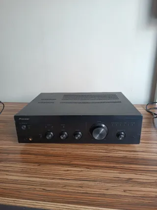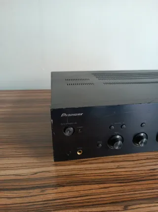 Amplificador integrado Pioneer en color negro. - Diseño elegante y compacto. - Controles frontales accesibles. - Conexiones para múltiples fuentes de audio. Restaurado. Con algún roce como se aprecia en las fotos. Bornas cambiadas. Tapa superior pintada