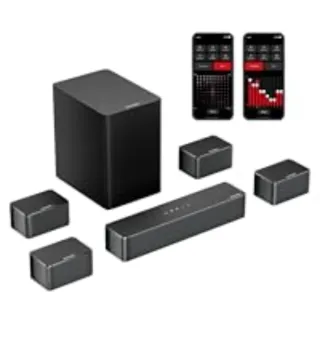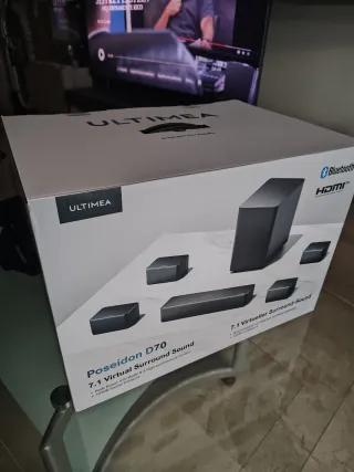 Sistema de sonido Ultimea Poseidon D70 con tecnología 7.1 Virtual - Como nuevo, en su caja Original. - Potente conjunto con sonidos graves muy buenos, mando a distancia, el subwoofer y traseros van sin cables respecto a los altavoces delanteros y barra, se recomienda usar por HDMI, tambien con Óptico Digital o Bluetooth. Calidad precio insuperable conjunto.