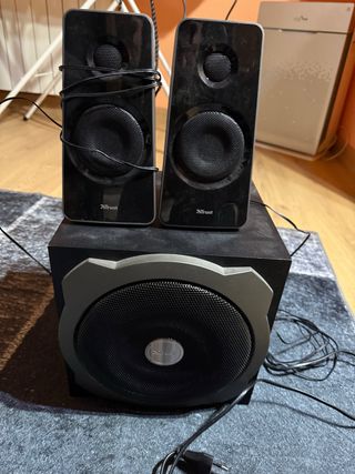Sistema de 5 altavoces con subwoofer, mando, cables de audio de cobre para conectarlos al subwoofer y un cable para conectar a móvil, pc... Tiene 3 canales, el 2.1 el 5.1 y el 6. Entrega en mano en Fuenlabrada. Negociable