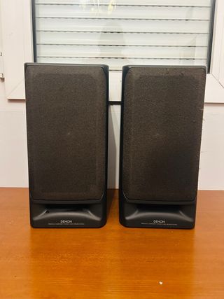 Par de altavoces Denon en color negro. - Diseño compacto. - Ideales para sistemas de audio personales.