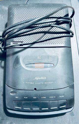 Reproductor de casetes portátil de la marca SuperTech. Cuenta con función de grabación con control de nivel automático. - Diseño compacto y ligero. - Botones de control de reproducción y grabación.