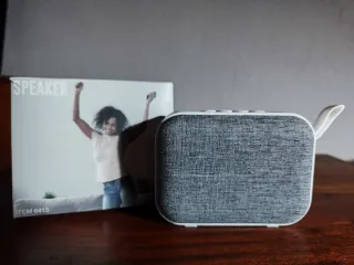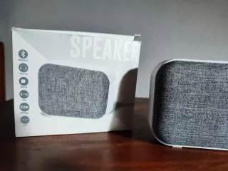 Altavoz portátil con un diseño moderno y compacto. - Acabado en tela gris. - Detalles en color blanco. - Asa para facilitar su transporte.