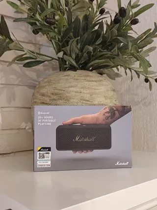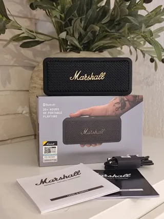 Altavoz portátil Marshall Emberton en color negro. Ofrece hasta 20 horas de reproducción. La caja está cerrada. La foto ha sido sacada del mismo producto que ya hemos vendido anteriormente. Repito, la caja de este producto va cerrada, precintada. - Conexión Bluetooth. - Diseño compacto y resistente. - Incluye cable de carga y manuales.