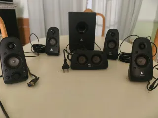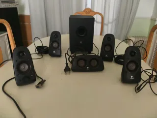 Sistema de altavoces Logitech con subwoofer y satélites. - Altavoz central con dos drivers. - Cuatro altavoces satélite. - Subwoofer negro. - Conexión por cable.