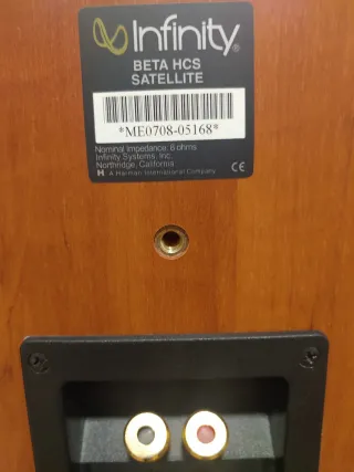 Conjunto de altavoces Infinity Beta HCS en color marrón. - Diseño compacto y elegante. - Conexiones traseras para cableado. Precio por unidad. Dispongo de 4 unidades Con sus respectivos pies.