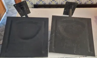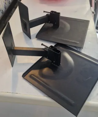Pareja de soportes metálicos negros para altavoces o televisores. Están en buen estado algunas marcas del uso pero nada grabe ,se ajustan en orientación y inclinación perfectos para poner unos altavoces sin agujerear las cajas o TV pequeña o cualquier cosa que se desee colgar son de buena calidad y resistencia La base mide 30cmx28cm - Fabricados en metal resistente. - Diseño para montaje en pared.
