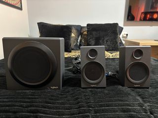 Sistema de altavoces Logitech en color negro y gris. - Incluye subwoofer y dos altavoces satélite. - Diseño moderno y compacto.