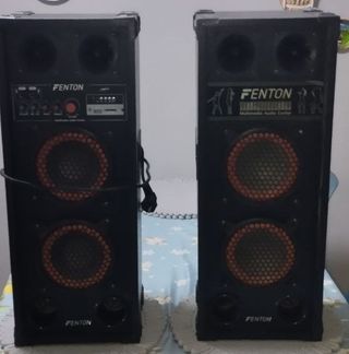 Se vende pareja de altavoces Fenton en color negro. - Diseño vertical. - Dos altavoces circulares con rejilla naranja en cada unidad. - Panel frontal con controles y entradas.