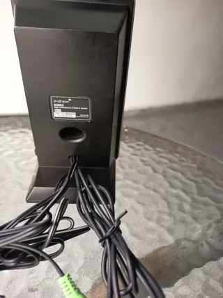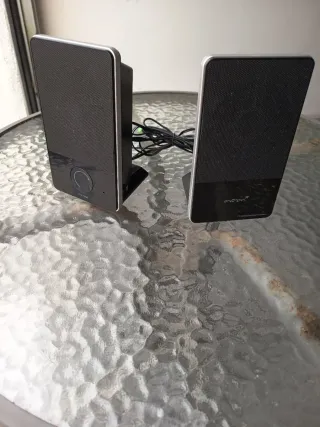 Altavoces de ordenador compactos y en muy buen estado - Diseño moderno en color negro. - Control de volumen integrado en uno de los altavoces.