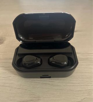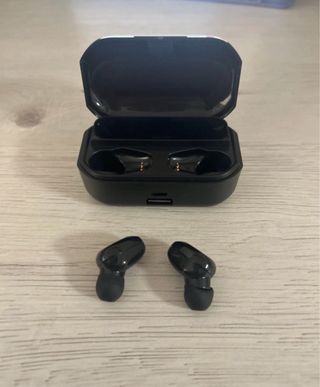 Auriculares inalámbricos negros con su estuche de carga. - Diseño ergonómico. - Estuche compacto.