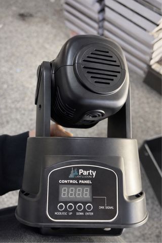 Cabeza móvil de iluminación para fiestas y eventos. Controlable por DMX. - Pantalla digital para configuración. - Botones de control: MODE/ESC, UP, DOWN, ENTER. - Indicador DMX SIGNAL.