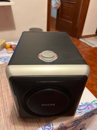 Subwoofer de la marca Philips con un diseño moderno. - Acabado en color negro y plateado.