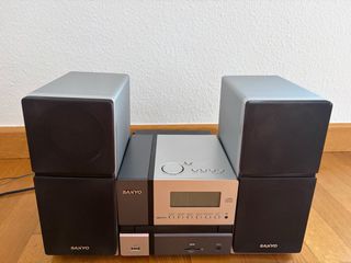 Equipo de música Sanyo con radio y reproductor de CD, acompañado de dos altavoces y mando a distancia. Bonito diseño, ligero y ocupa poco espacio. - Diseño en color negro y plateado. - Incluye dos altavoces. - Funciones de radio y CD. -Mando a distancia.