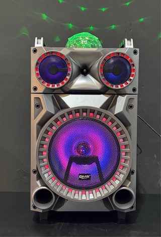 Altavoz DMS modelo K7-12PMH1 con una potencia de 14000W P.M.P.O. Diseñado con una combinación de colores plateado y negro. - Potencia: 14000W P.M.P.O. - Modelo: K7-12PMH1. - Diseño moderno. -USB/SD/MP3/BT/FM radio