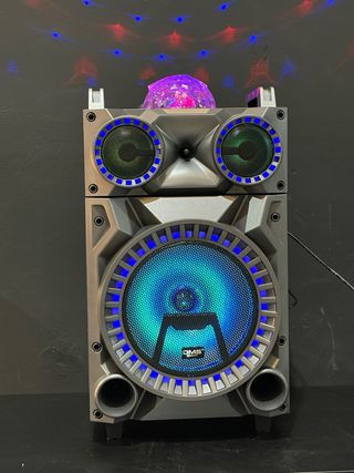 Altavoz portátil con diseño llamativo y múltiples funciones. - Conexión Bluetooth y entrada USB. - Incluye radio FM. - Asa para fácil transporte.