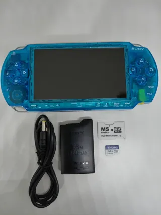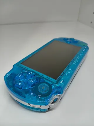 PSP 1006 Custom color Azul trasparente, todo funciona: pantalla, botones, joystik, sonido, lector y puertos. Juegos en tarjeta: PSP, Nes, GBA, Snes y megadrive. Incluye: -PSP 1006 ✅ -Bateria nueva ✅ -Cargador nuevo ✅ -Adaptador MemoryStick sd ✅ -Tarjeta sd 64gb ✅