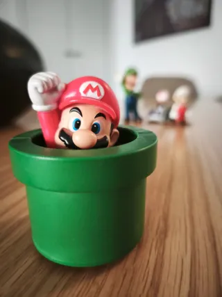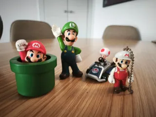 Colección de figuras del universo Mario y Luigi. 8 euros por las cuatro. - Figura de Mario saliendo de una tubería verde. - Figura de Luigi con su característico overol azul. - Figura de Mario con gorra blanca y traje rojo, con cadena para llavero. - Coche de carreras con Toad al volante. Envío rápido. Descuento en lote. --- Super Mario Kart Mario Bros ítem fuego seta Galaxy World