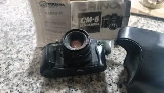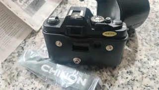 Cámara analógica Chinon en color negro. Incluye su funda protectora y correa. - Funda de cuero negra. - Correa de tela con logo Chinon.
