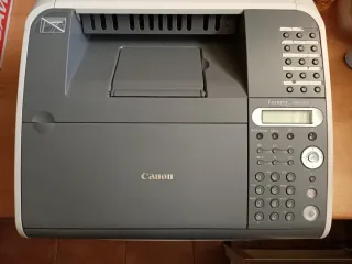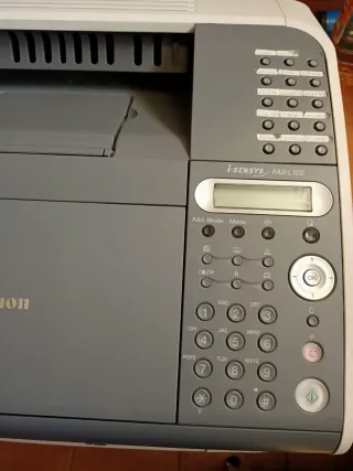 Fax Canon i-SENSYS FAX-L100 en color gris y blanco. - Panel de control con pantalla LCD. - Teclado numérico y teclas de función.