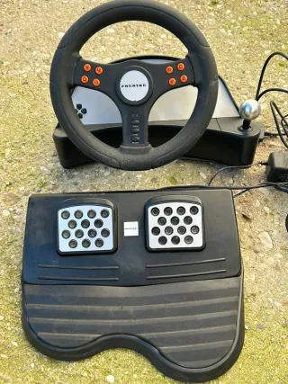 Volante de conducción para PlayStation 1 con pedales. - Volante con agarre texturizado. - Botones de acción naranjas. - Palanca de cambios. - Pedales con superficie antideslizante.