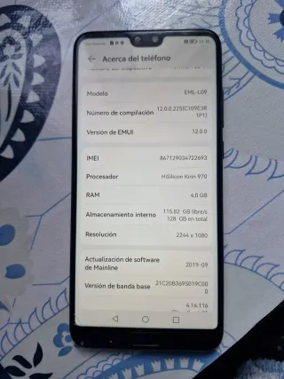 Teléfono móvil Huawei P20 con 128 GB de almacenamiento interno. La esquina izquierda tiene un pequeño roto que no afecta en nada a su funcionamiento, regalo dos protectores de pantalla de cristal templado - Modelo EML-L09. - Procesador HiSilicon Kirin 970. - 4,0 GB de RAM. - Resolución de pantalla 2244 x 1080. - Versión de EMUI 12.0.0.